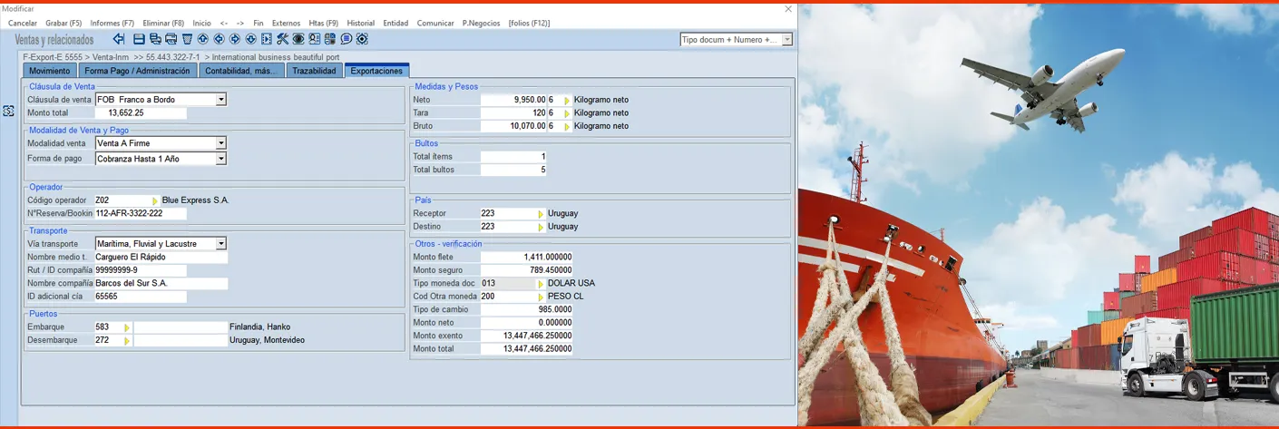 Agrega un folio o pestaña de Exportaciones en los documentos que corresponda para gestionar los datos propios de esta actividad, información que, además de quedar disponible para ser consultada, es enviada al XML en cumplimiento de la ley chilena, y se incluye en la muestra impresa o PDF del DTE de Exportación según se haya definido.