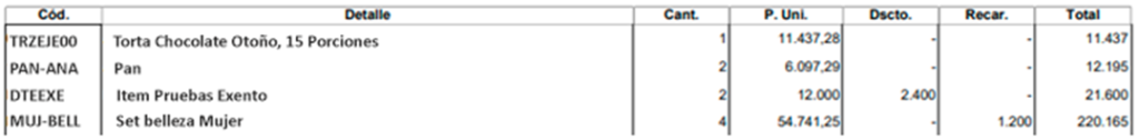 • Encuentra al menos 1 detalle que tenga descuento individual del tipo indicado, y que no sea un producto exento, y que no incluya impuestos adicionales.