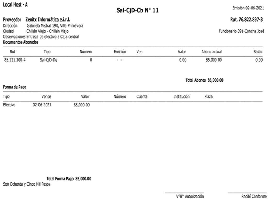 Puede emitir el comprobante estándar impreso para firma y constancia de las partes, con las copias que desee, el que también expresa los montos en negativo.