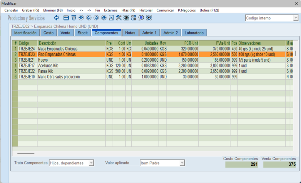 El registro maestro de cada producto o servicio de los tipos compuesto y producido, en su folio de Componentes, permite y obliga a definir al menos un componente o insumo. Aquí especifica la lista estándar de los componentes o los insumos, cargando los que sea necesario desde la misma tabla de productos y servicios, en base a códigos que ya deben existir en esta.