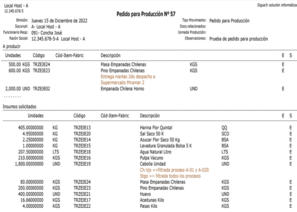 En el ejemplo el usuario indica que se entregan insumos para producir 1.000 empanadas de las 2.000 solicitadas inicialmente, ante lo cual el ERP ajusta los insumos, y quedarán 1.000 unidades pendientes en el pedido para producción correspondiente.
